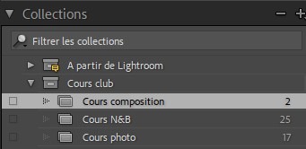 Il y a aussi des collections dynamiques : vous indiquez des critères et la collection se remplit automatiquement avec les photos répondant à ce critère : On peut, pas exemple, faire une collection des photos noir et blancs ayant le mot clé « Montagne ».
