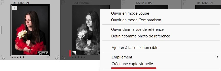 Si vous avez besoin de faire des traitements différents sur une même photo (un noir et blanc, une photo couleur, une recadrée sur une partie), vous pouvez créer des copies virtuelles de la photo (clic droit sur la photo, clic sur ‘Créer une copie virtuelle »). En interne Lr copie simplement l’enregistrement de la photo une seconde fois dans le catalogue (la photo elle même n’est pas copiée). Bien pratique quand on veut faire une version couleur et une version noir et blanc. Les copies virtuelles prennent donc peu de place, elles ont un signe distinctif en bas à gauche.