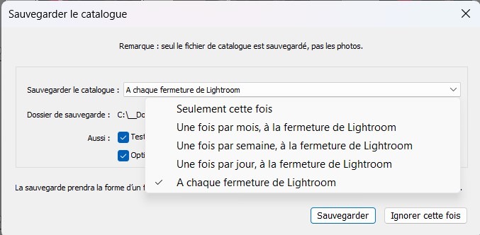 Quand vous fermer LrC, il vous propose de faire une sauvegarde du catalogue (à la fréquence que vous avez choisi dans le menu déroulant : à chaque sortie, chacun semaine…).